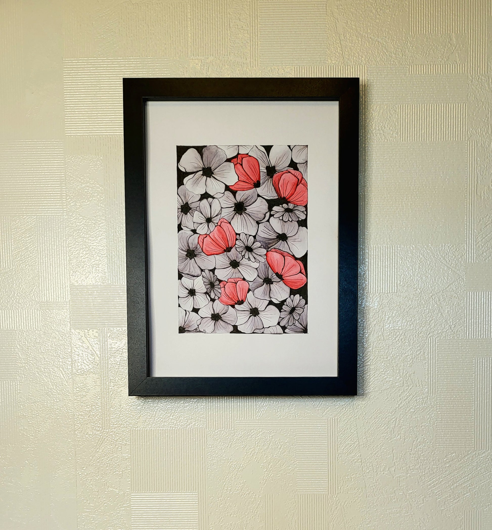 Les nuances de couleur et les traits précis donnent vie à ce bouquet de coquelicots, offrant une touche artistique à votre espace.