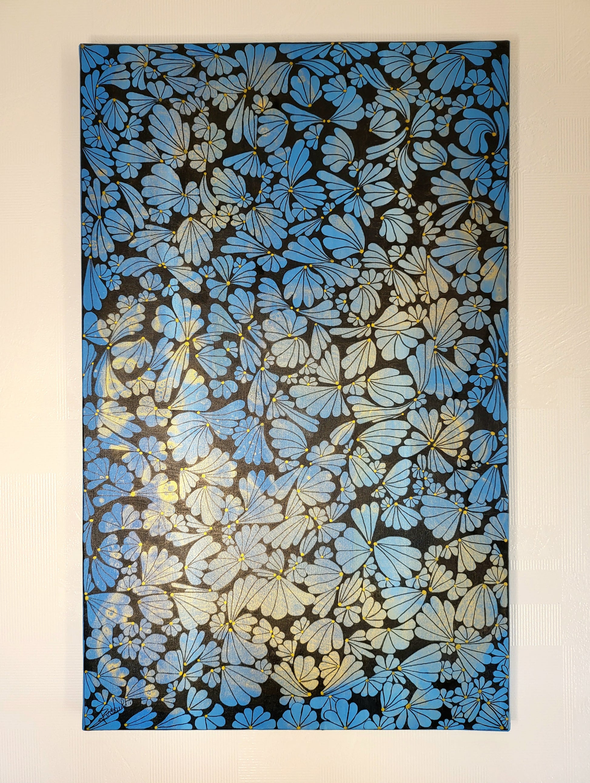 La Dentelle de Marguerite est un tableau élégant qui met en valeur un fond bleu et or.