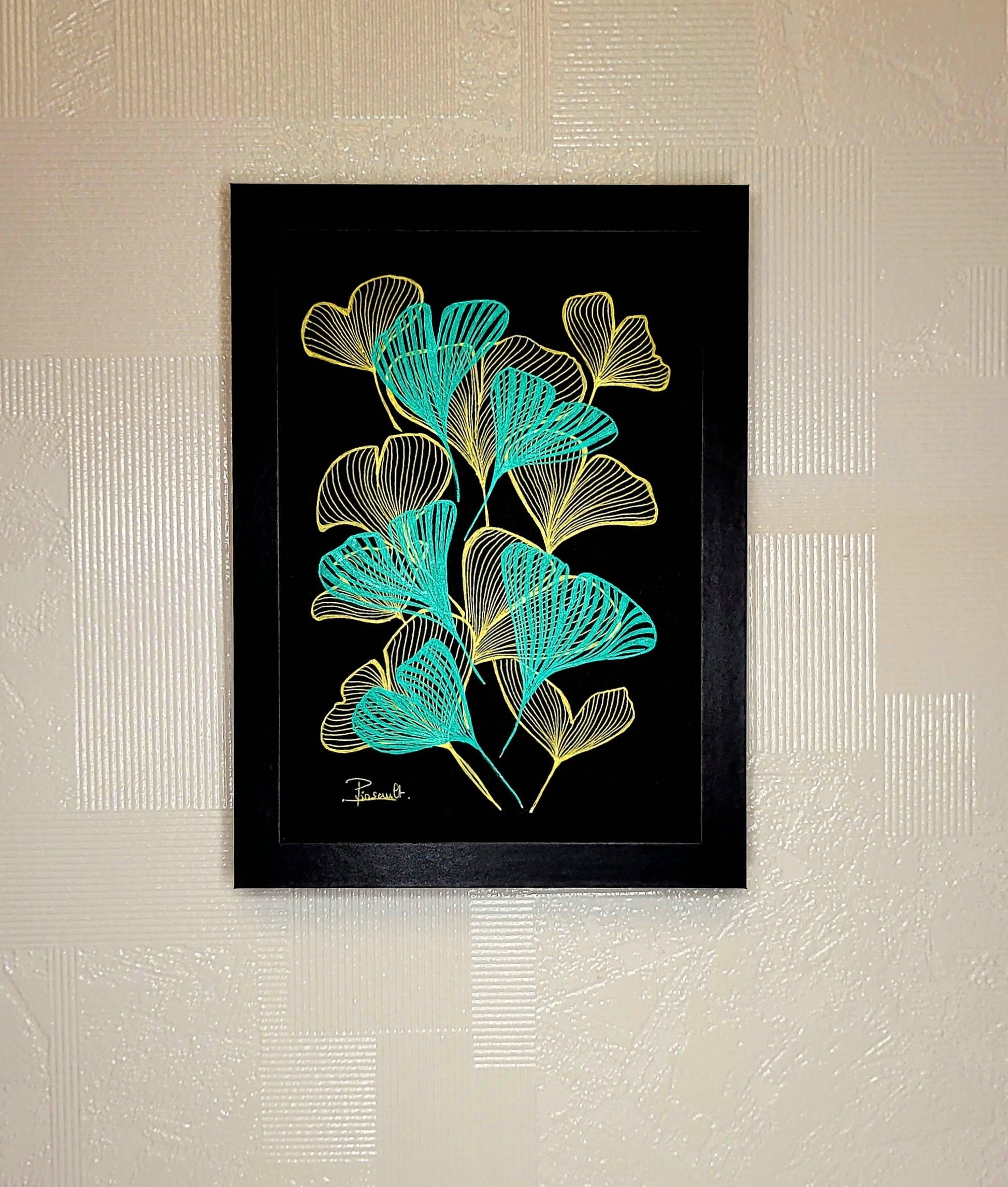 Ce tableau est accentué par l'encre dorée et turquoise, capturant toute son essence.